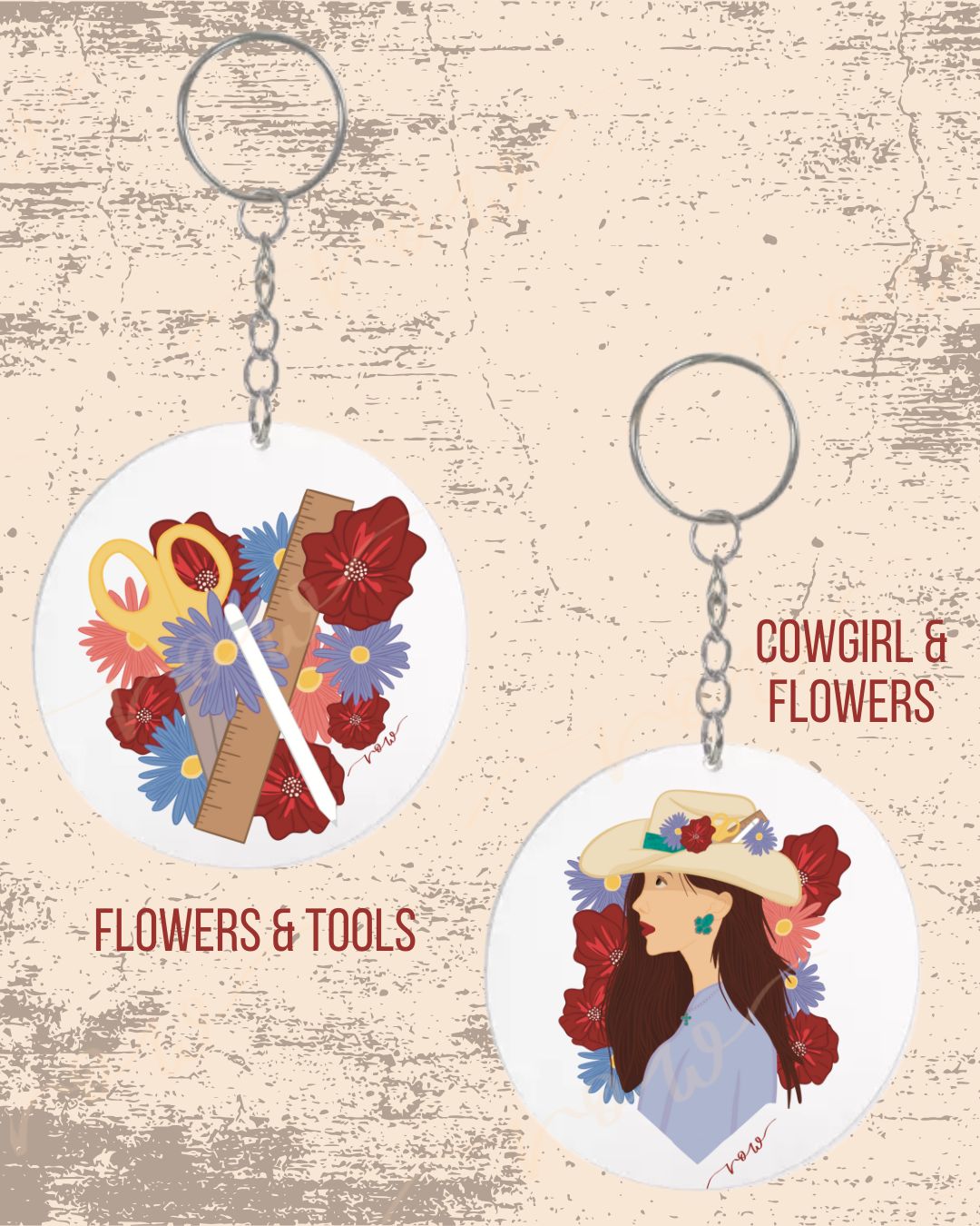 ROW original exclusive designs available on round acrylic keychains!